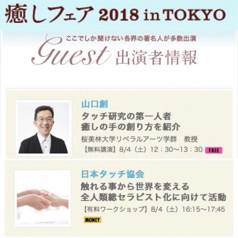 心とカラダそして地球にやさしい癒し関連の商品・サービスが一度に体感できる総合見本市である「癒しフェア 2018」にて、日本タッチ協会が出演します。当協会代表、山口創は「タッチングとオキシトシン」に関する最新の研究結果をご紹介する無料講演を行います。また「触れることから世界を変える 全人類総セラピスト化」をテーマに、協会共同代表 有本匡男と、協会理事 小松ゆり子による「「癒しの手」を創る ワークショップ」も開催いたします。